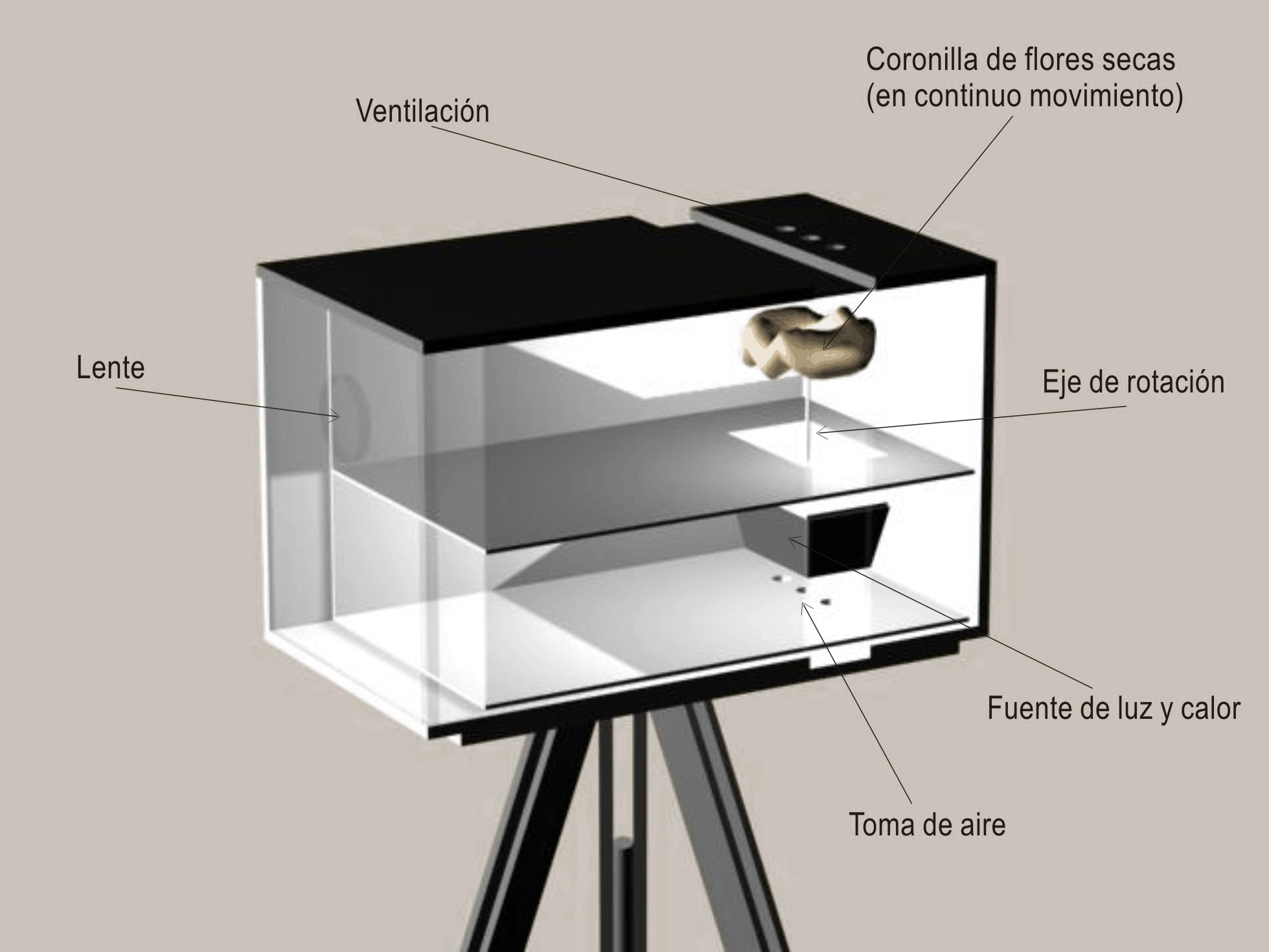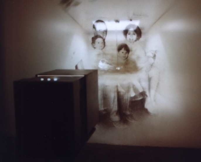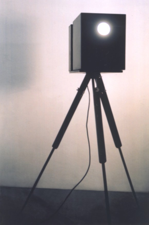 1973 es en una instalación con carácter de intervención edilicia (Site-specific). Para su desarrollo me valgo del principio de la cámara oscura, principio esencial para la generación de toda imagen fotográfica. Este recurso despojado, lo invierto, transformándola en una cámara clara (grafico). Convirtiéndose el exterior en una gran cámara oscura, donde se proyectan imágenes simbólicas de un universo temporal.