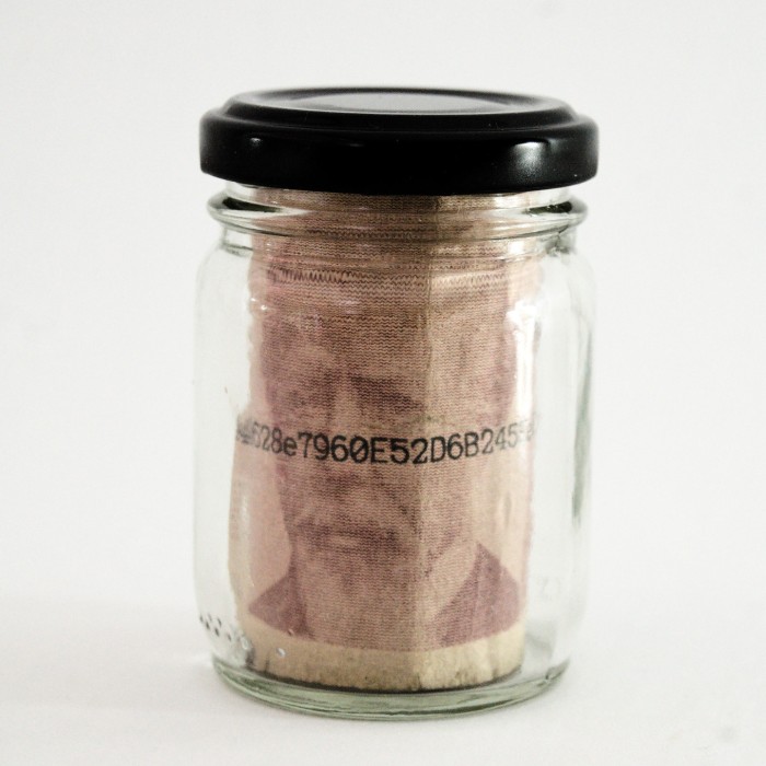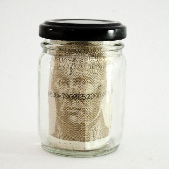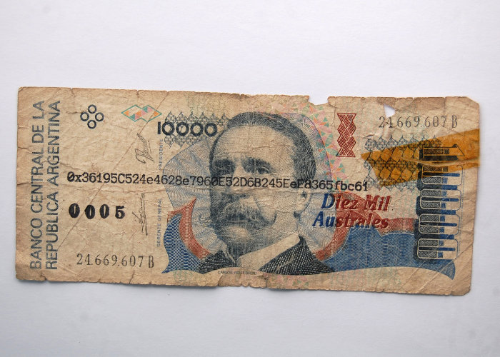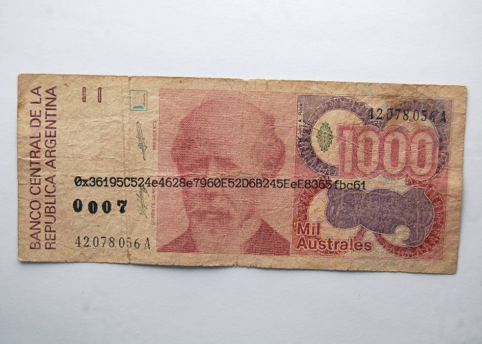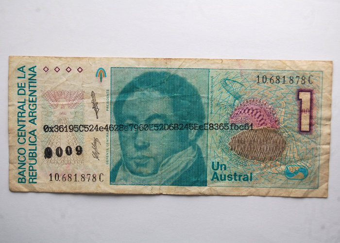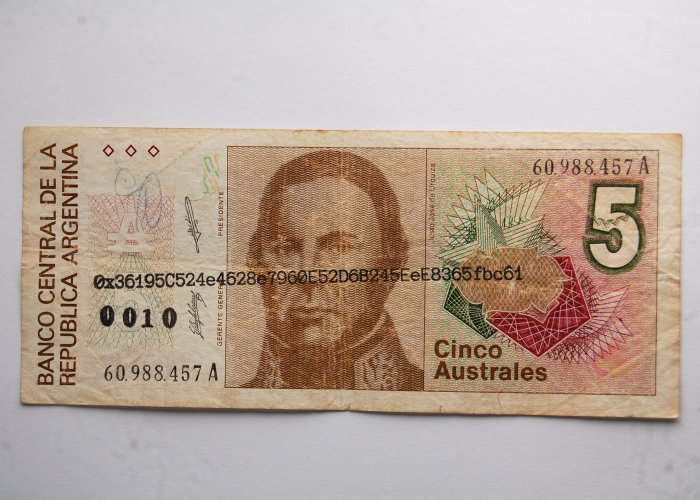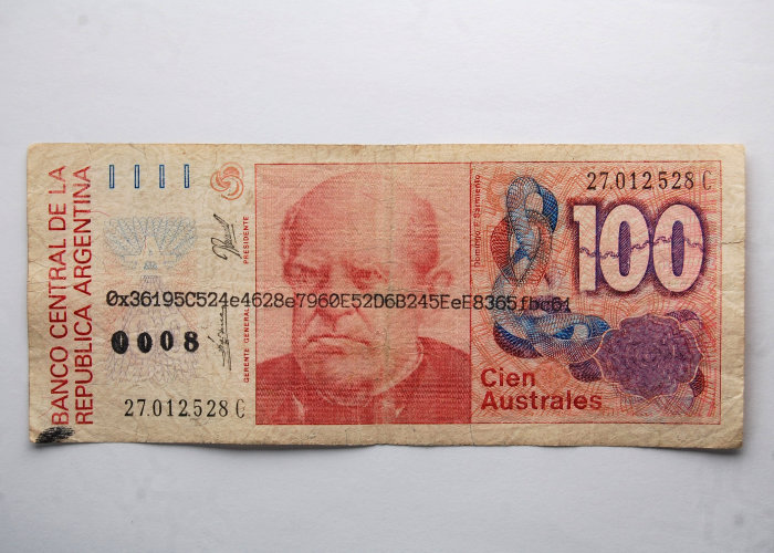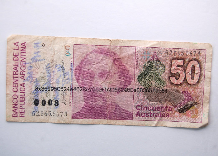Cada billete o resto es sellado con el hash del contrato Ethereum y su ID identificador. Este trabajo toma billetes de Australes, vales de trueque (mercados solidarios 2001) y Pesos argentinos actuales.