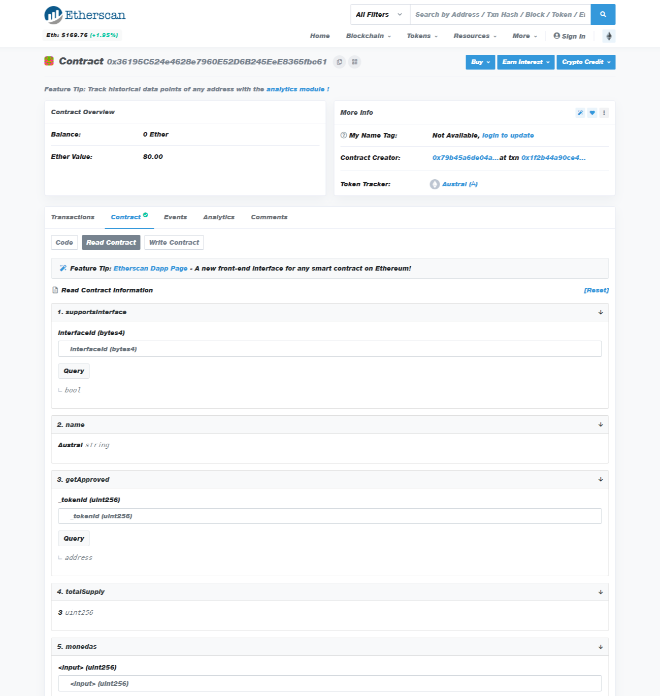 Para la creación del Criptoaustral se confecciono un contrato inteligente en la red Ethereum. Cada billete/valor es almacenado en la cadena de bloques, con sus identificadores: valor, valor en letras, número de serie y año de emisión. Los datos se almacenan en forma de toquen no fungible vinculando cada token con una imagen o video que documenta el origen o proceso que inicia la criptodivisa (archivos almacenados IPFS).