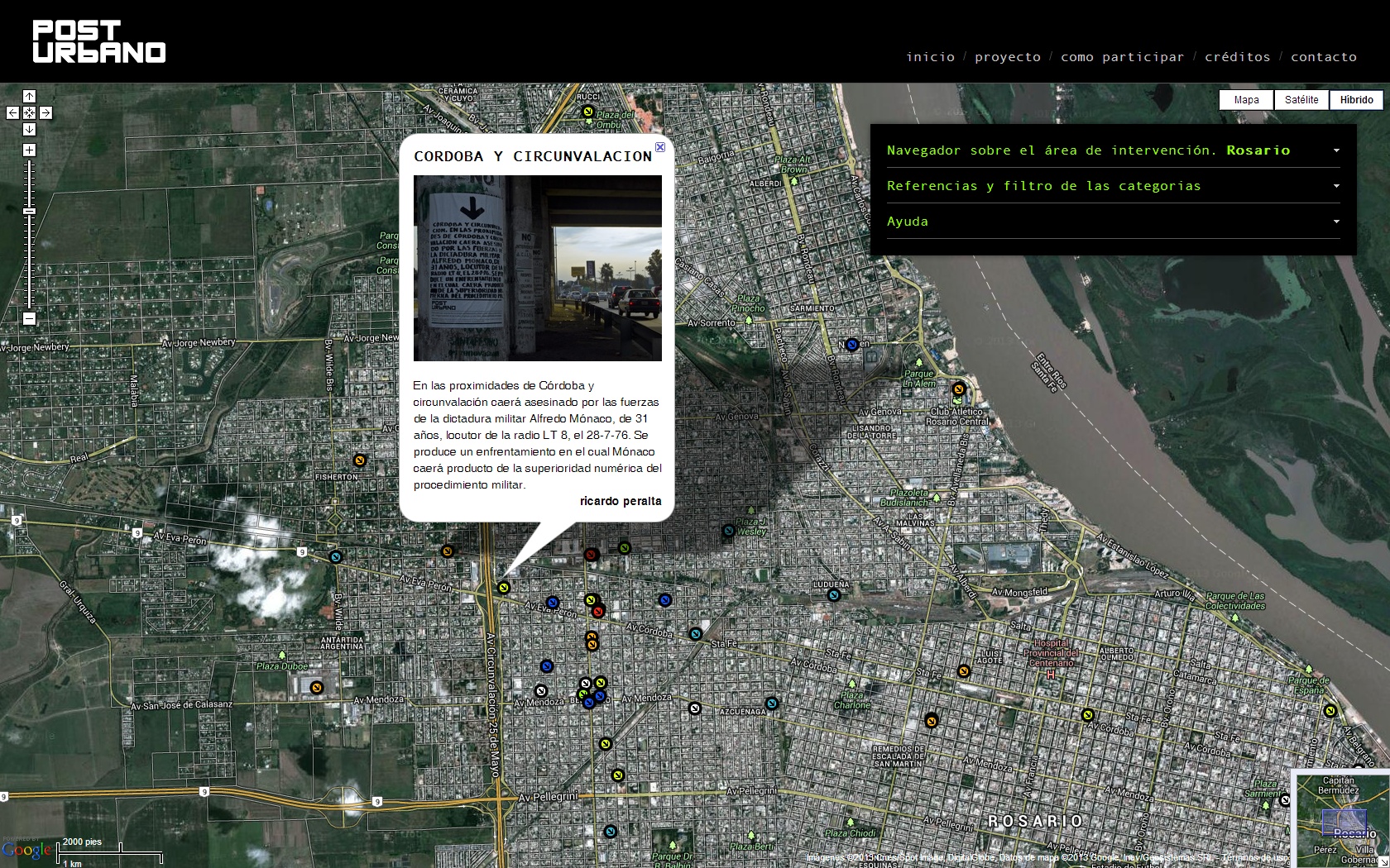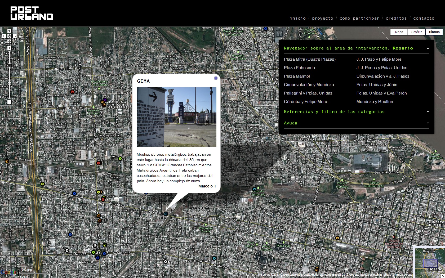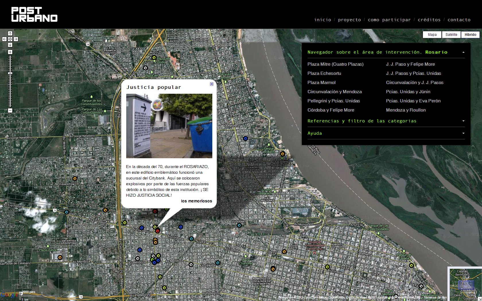 Para crear esta plataforma se utilizó la Web y a Google Maps como soporte técnico, que permitió crear una aplicación Web incorporando las imágenes satelitales. A partir de funcionalidades como los Placemark, se incorporó información, construyendo una base de datos con relatos y vivencias. Estos mecanismos hicieron posible pensar una plataforma de construcción simbólica sobre el barrio.